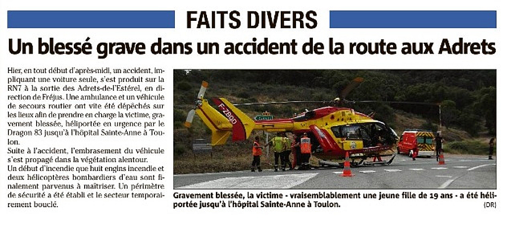 Un accident s’est produit vendredi 03 août dernier sur la RN7 aux Adrets de l’Esterel, et le début d’incendie de la végétation qui s’en est suivi a été pris en charge par nos patrouilleurs CCFF des Adrets, avec l’aide d’une patrouille des CCFF de Fréjus.