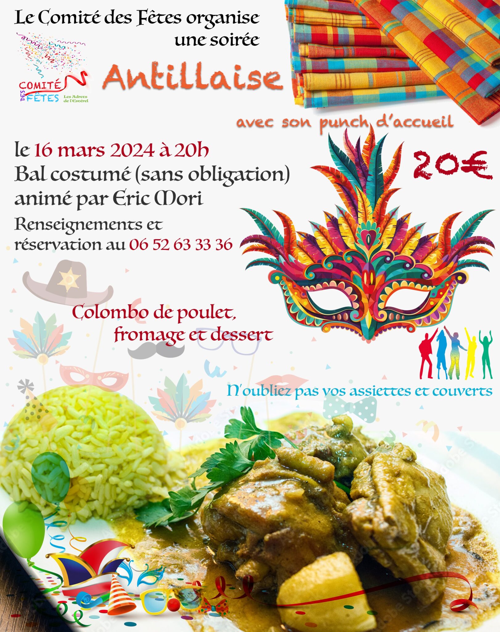 Tarif repas: 20€ (Punch d’accueil, Colombo de poulet, fromage et dessert – N’oubliez pas vos assiettes et couverts)