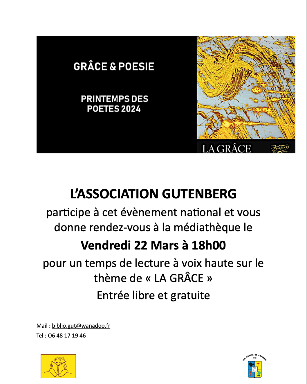 A l’occasion du Printemps des Poètes, l’association Gutenberg vous donne rendez-vous à la médiathèque le VENDREDI 22 MARS à 18h00 pour un Club Lecture autour du thème de La Grâce.