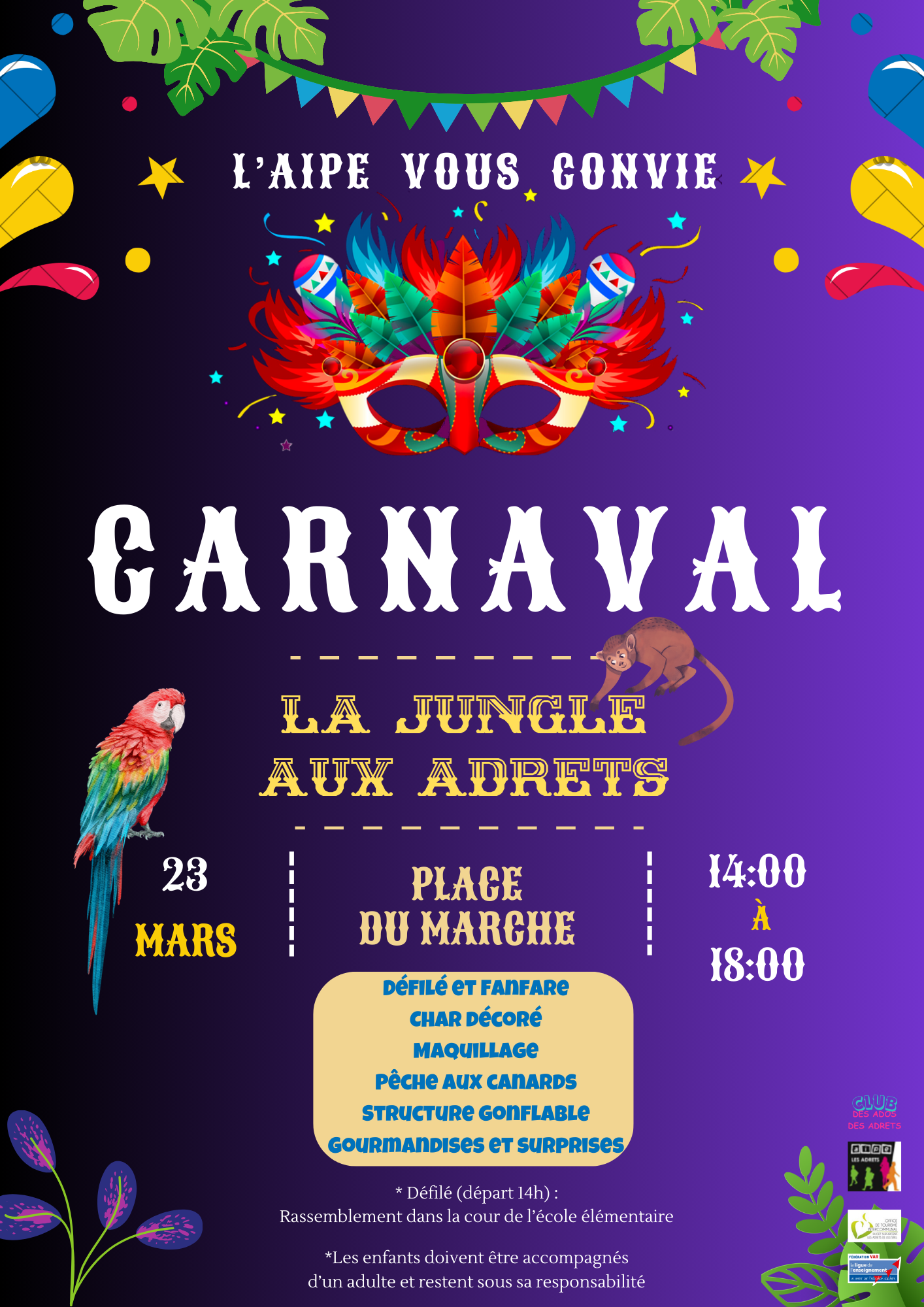 L’ Association Indépendante de Parents d’ Elèves organise un carnaval aux Adrets-de-l’Estérel sur le thème « La jungle aux Adrets ».
