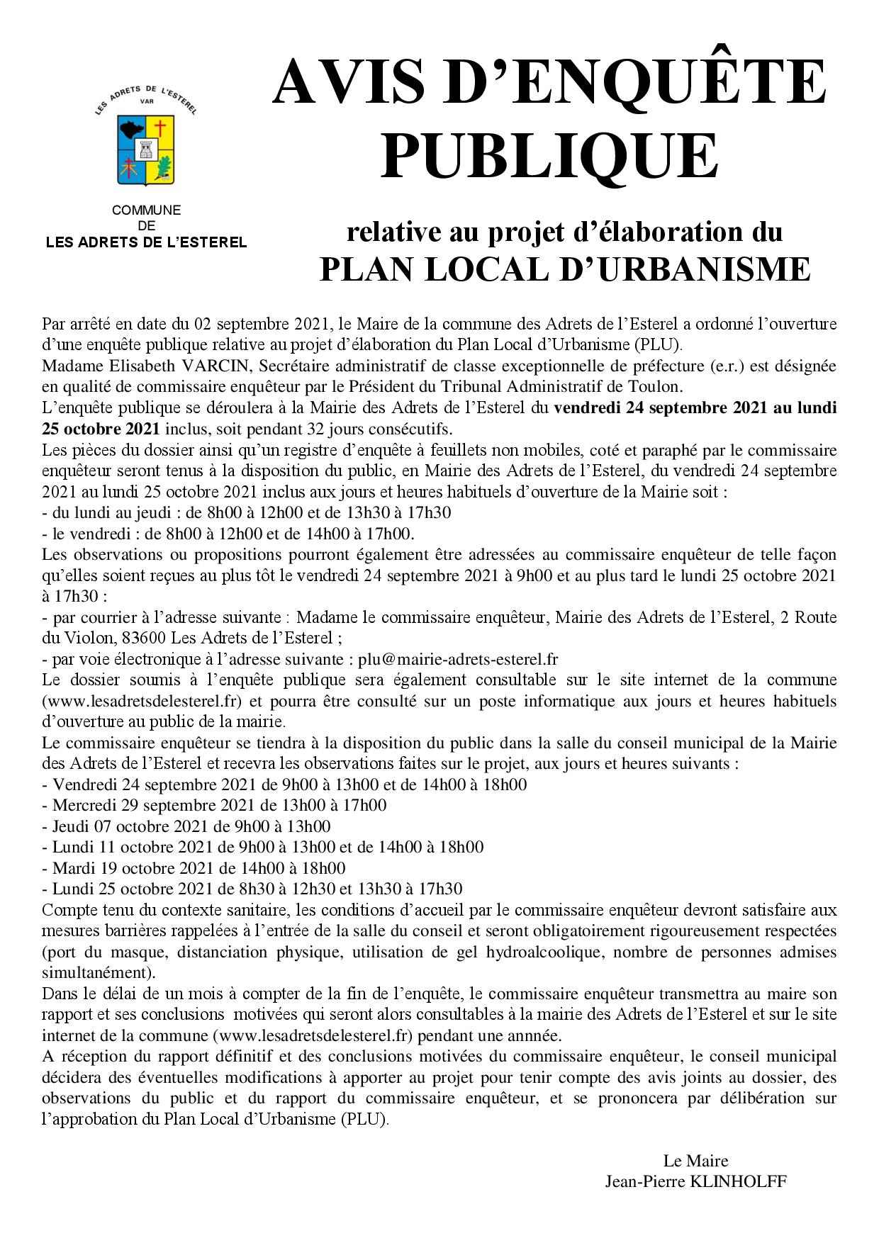 L’enquête publique se déroulera à la Mairie des Adrets de l’Esterel du vendredi 24 septembre 2021 au lundi 25 octobre 2021 inclus, soit pendant 32 jours consécutifs.