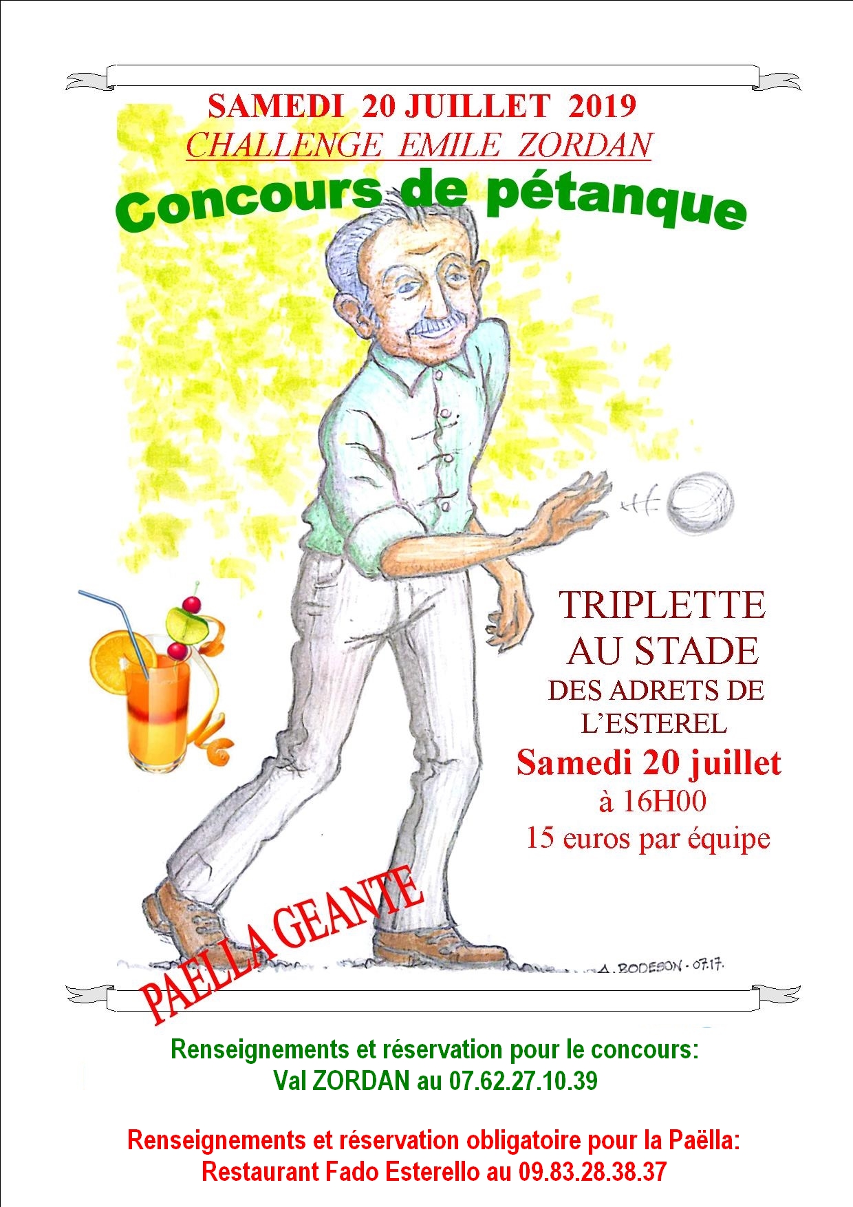 Pour renseignements et réservation, contactez : Val Zordan au 07 62 2710 39 Restauration possible sur place (Paella géante) préparée par le restaurant FADO Esterello. Renseignements et réservation obligatoire en contactant le restaurant au 09.83.28.38.37.