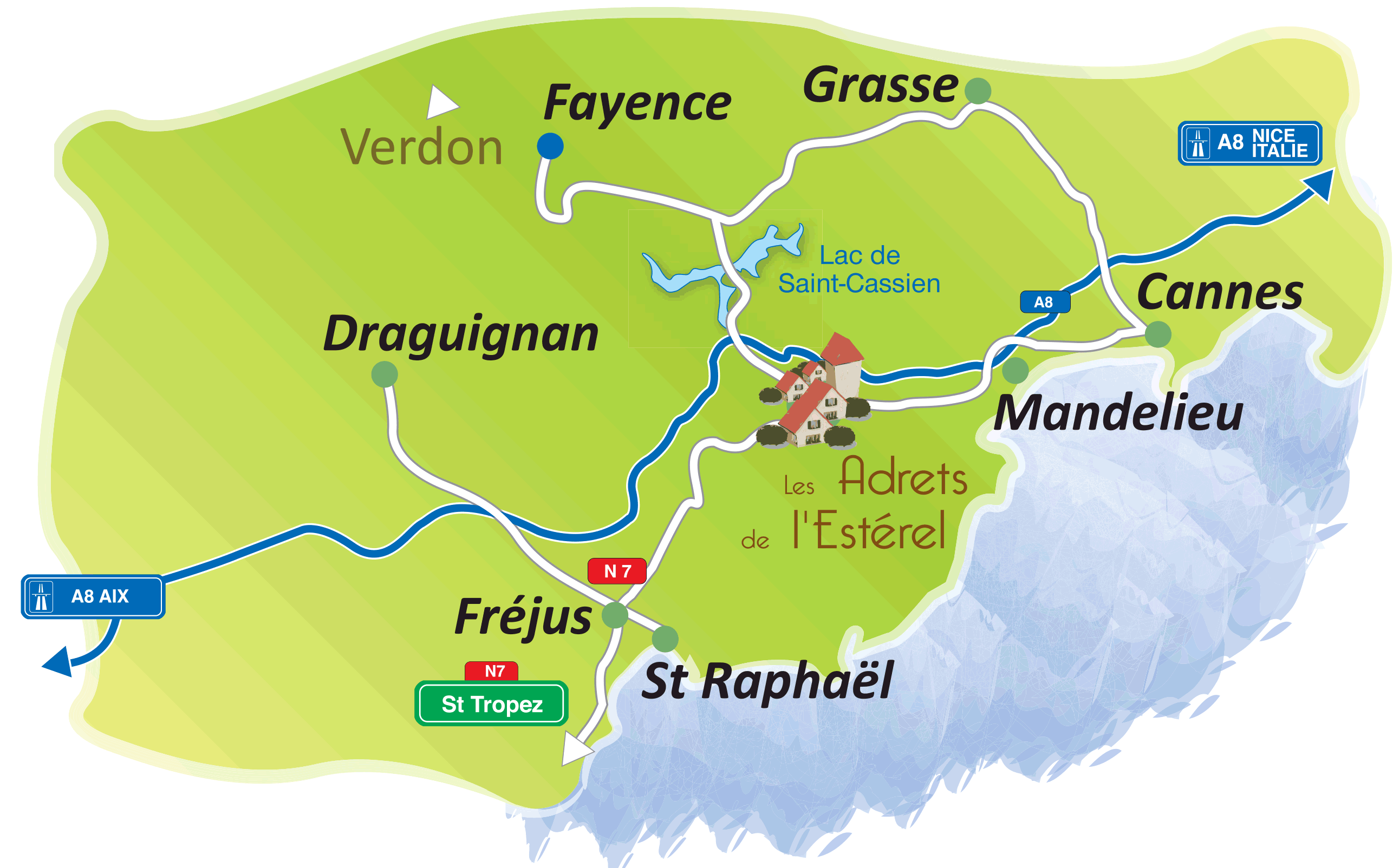 Via DN7 par Mandelieu-la-Napoule (06210), puis Saint-Jean-de-Cannes et Saint-Jean-de-l’Estérel.