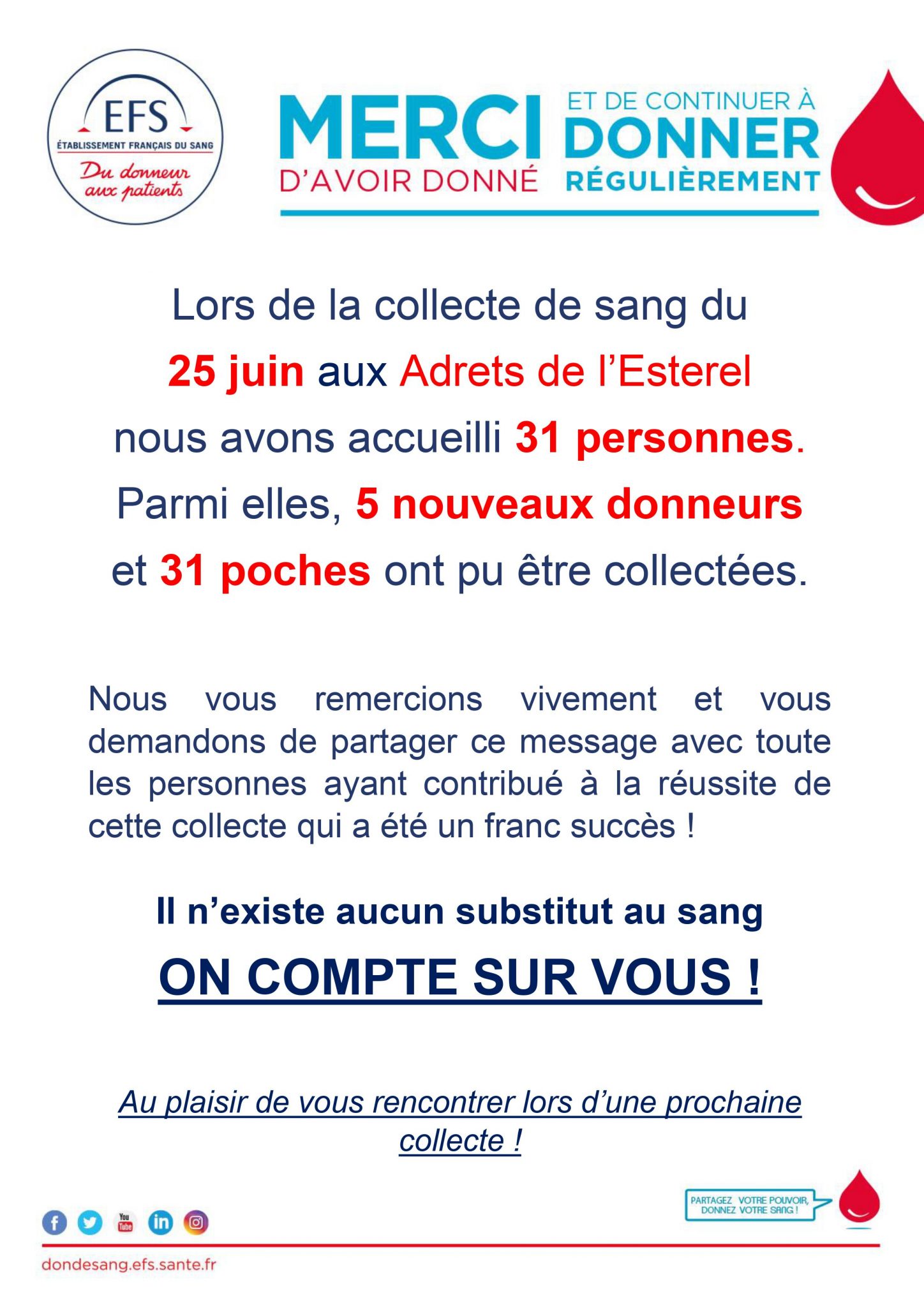 La commune des Adrets de l’Estérel se joint à l’EFS pour remercier les 31 personnes qui ont permis de récolter 31 poches de sang.