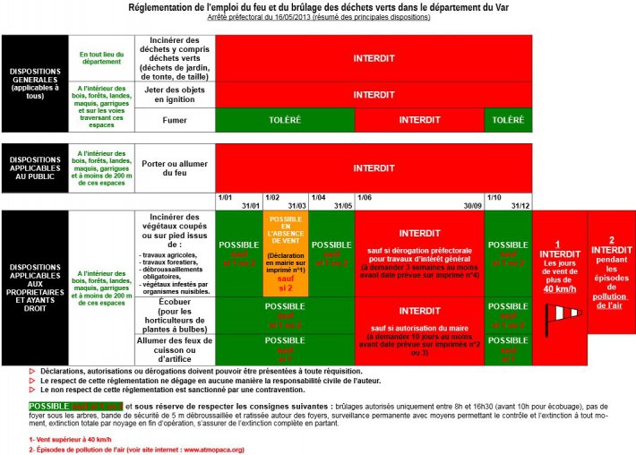 L’emploi du feu dans le Var est réglementé par l’arrêté préfectoral du 16 mai 2013 selon un calendrier précis. Merci de vous y référer.