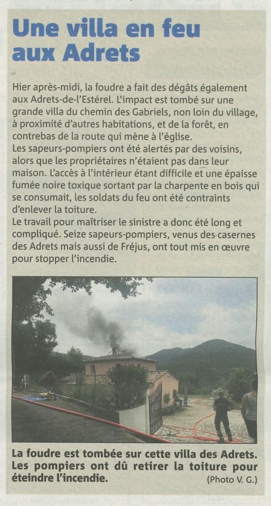 La commune des Adrets de l’Estérel vous remercie pour votre efficacité et pour votre bravoure. Ci-joint, l’article Var Matin du 28/07/2019 (V.G) concernant l’une des maisons touchée: