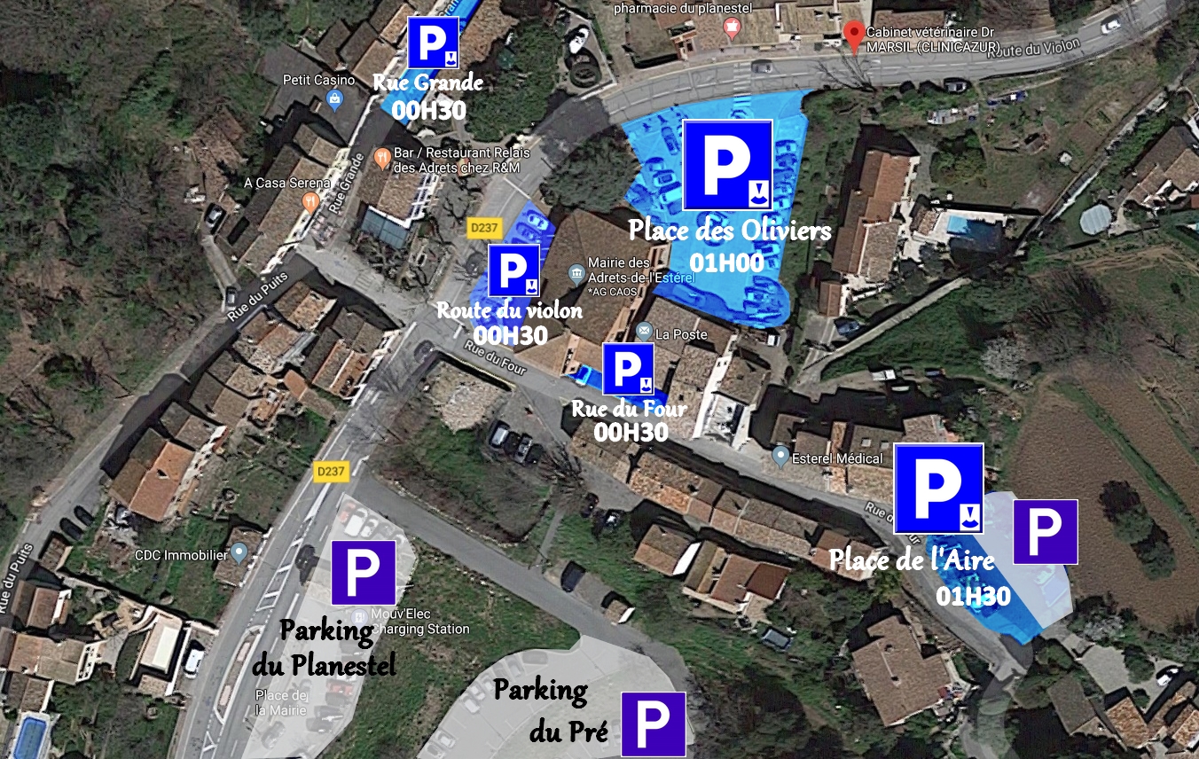 Délimitées par un marquage au sol bleu, ces emplacements sont gratuits mais à durée limitée. Ils sont soumis aux dispositions de l’arrêté municipal 2018-071.